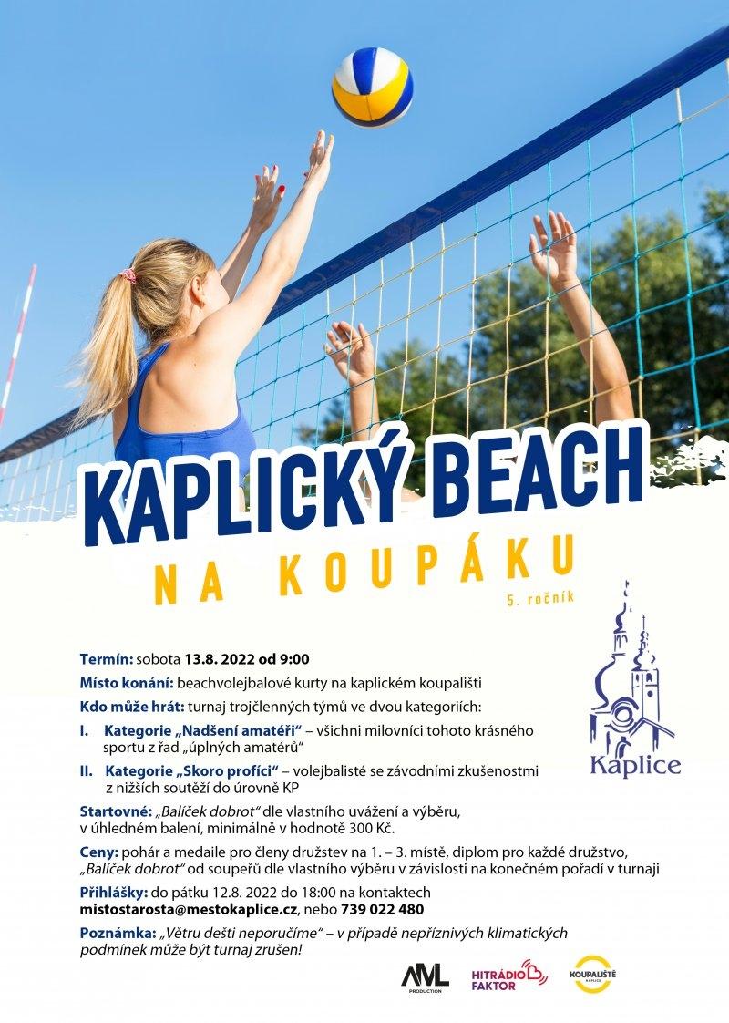V sobotu 13.8. 2022 proběhne v areálu kaplického koupaliště již 5. ročník beachvolejbalového turnaje „Kaplický beach na koupáku“.