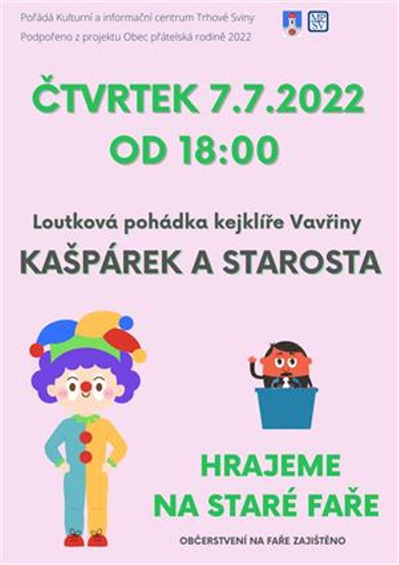 Kulturní a informační centrum Trhové Sviny srdečně zve velké i male na loutkovou pohádku KAŠPÁREK A STAROSTA od 18:00 v areálu staré fary.