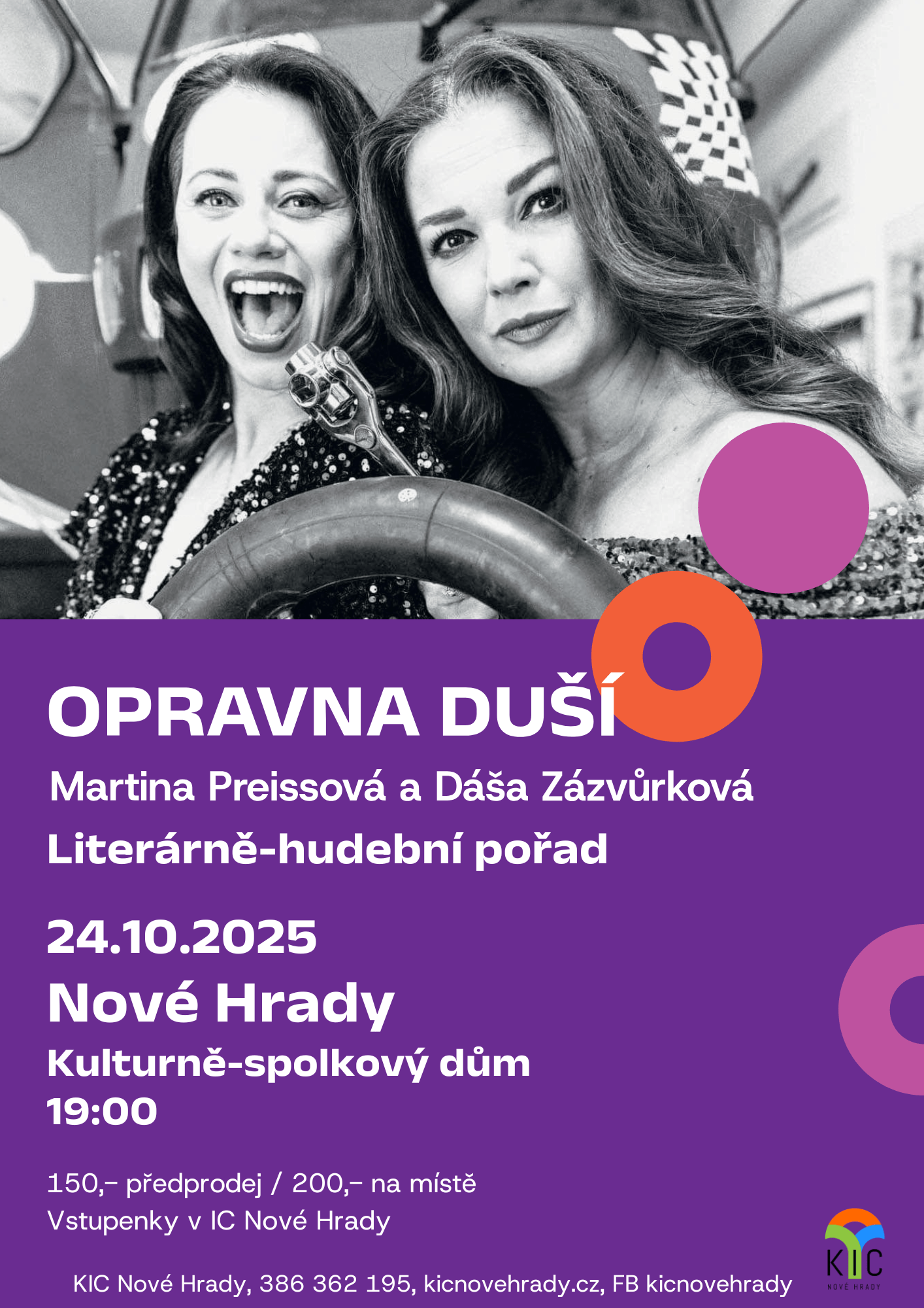 Vstupenky v prodeji od 2.10. na IC, 150 Kč v předprodeji/200 Kč na místě KIC Nové Hrady, tel.: 386 362 195, 602 150 208