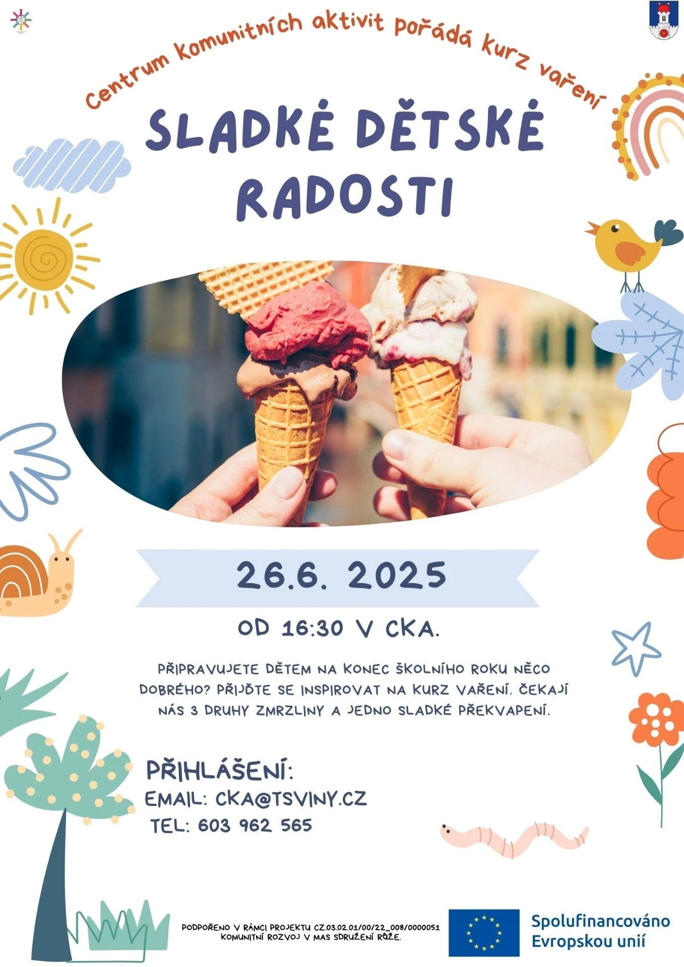 26. 6. 2025 od 16:30 vás srdečně zveme na kurz vaření s názvem Sladké dětské radosti. Jelikož se blíží konec školního roku, tak se společně naučíme vyrábět 3 druhy zmrzliny a také sladké překvapení pro děti. A nebojte, děti vám určitě dají ochutnat.