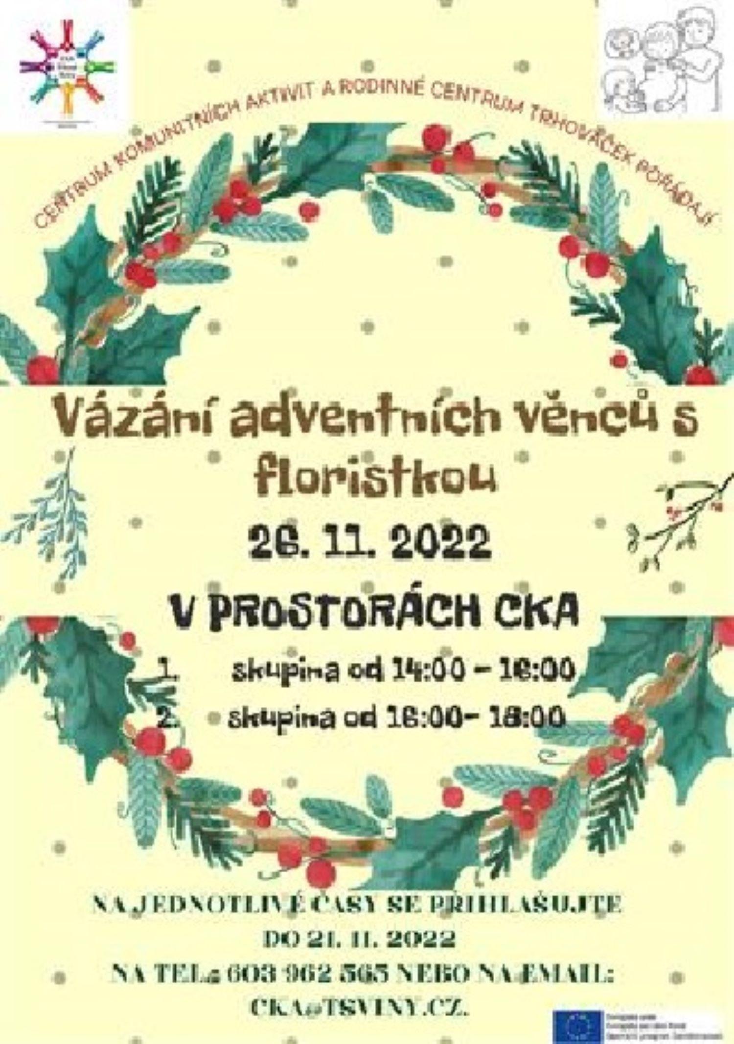 Centrum komunitních aktivit a Rodinné centrum Trhováček pořádají kurz vázání adventních věnců a svícnů pod vedením floristky. Na akci je nutné se přihlásit. Máme 2 skupiny. Bližší informace najdete na plakátu.
