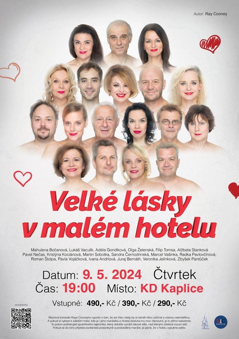 Ve čtvrtek 9.5.2024 od 19:00 uvede divadlo Háta bláznivou divadelní komedii Raye Cooneyho VELKÉ LÁSKY V MALÉM HOTELU.